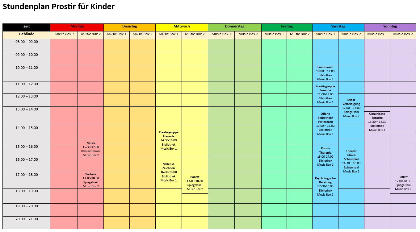 Im Stundenplan finden Sie nur unsere wöchentlich stattfindenden Angebote. Zusätzlich organisieren wir viele einmalige und unregelmässig wiederkehrende Veranstaltungen, z. B. Feste, Feiertagsprogramme, Workshops, Ferienangebote, Ausflüge, Spaziergänge sowie Koch- und Backkurse.