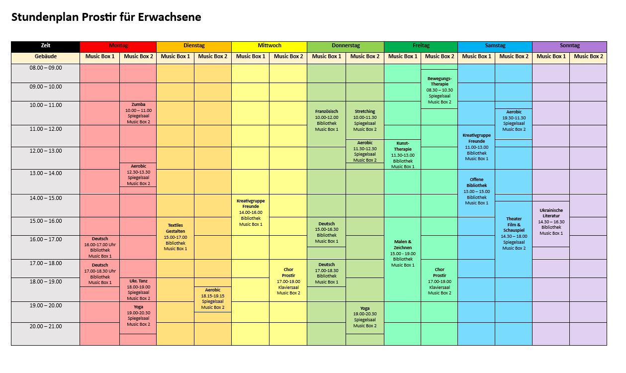 Im Stundenplan finden Sie nur unsere wöchentlich stattfindenden Angebote. Zusätzlich organisieren wir viele einmalige und unregelmässig wiederkehrende Veranstaltungen, z. B. Feste, Feiertagsprogramme, Workshops, Ferienangebote, Ausflüge, Spaziergänge sowie Koch- und Backkurse.